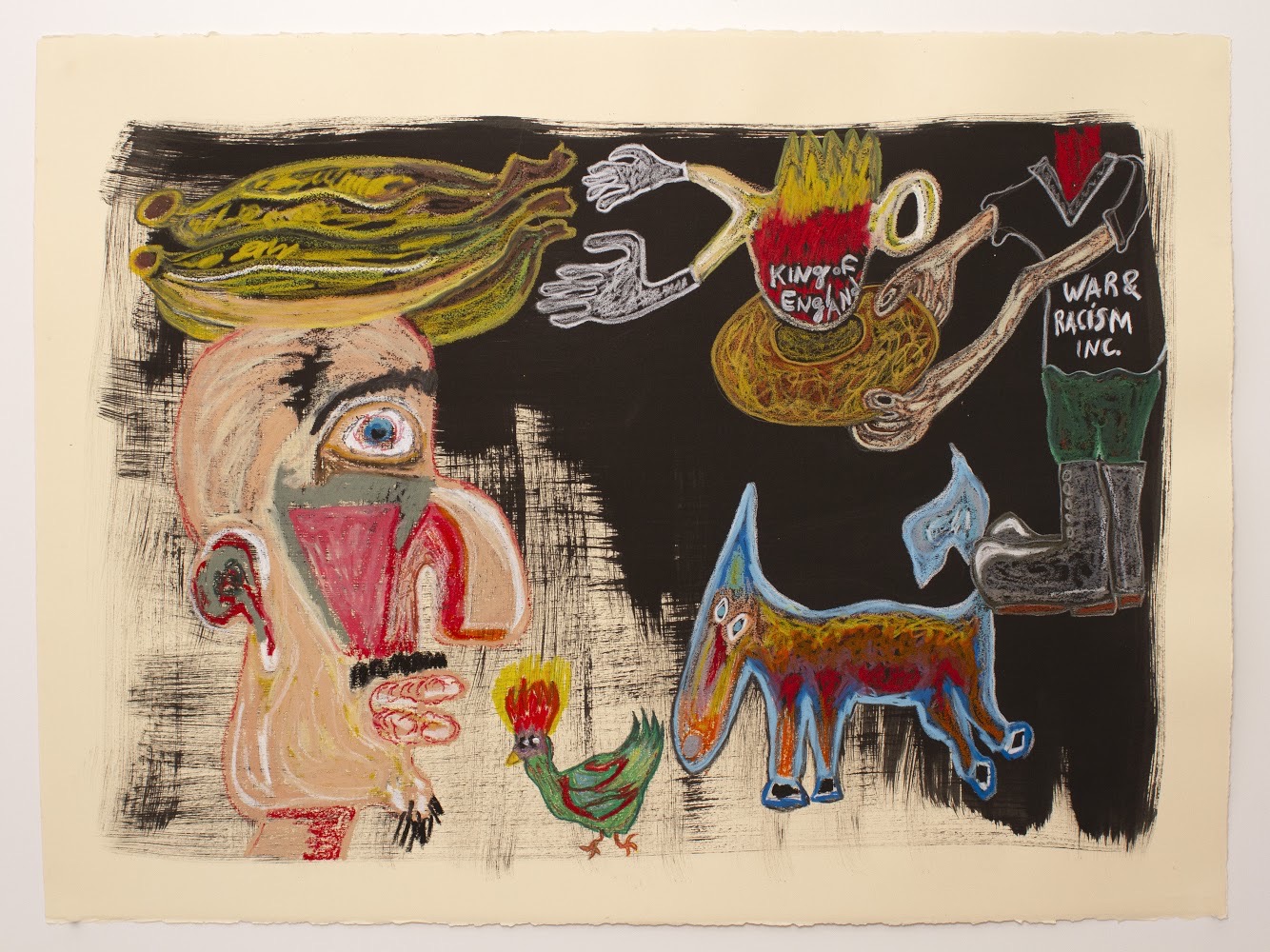 Among the works he intends to show at Spring Break, I can underline the significance of “pangaré”, a mixed race horse and “vira-lata“ (mutt), the mixed race dog that until today come up in conversations between Brazilians every time they intend to illustrate the lack of pedigree in the Nation as an argument to explain the lack of success in any endeavors that Brazil might be undertaking at the moment. Racism is deeply instilled in the imaginary of the Brazilian. Pinheiro-Machado’s work is heavily charged with irony. For instance, the General holding a giant banana and almost falling from the back of the “pangaré“, an oil pastel drawing made on a collage of pages from Calvin’s Commentaries, bringing the idea of Reform as something already outdated in the Brazilian context. Both “Madona das Bananas”, in which a woman holds a deformed baby, and “Thinker“, where we can see a man with bananas on his face, stand for a beat down people that emulates color and energy like nothing else, one of the greatest contradictions of the Brazilian society. Color is the counterpoint to poverty, exploitation, racism and all maladies of our days. To mention Jorge Luis Borges, “the metaphysicians of Tlön don’t search for the truth, nor even verisimilitude: they search for a sense of awe.“ Similarly, Pinheiro-Machado searches for awe, but in the sense of the amazement that a child sees something for the first time.