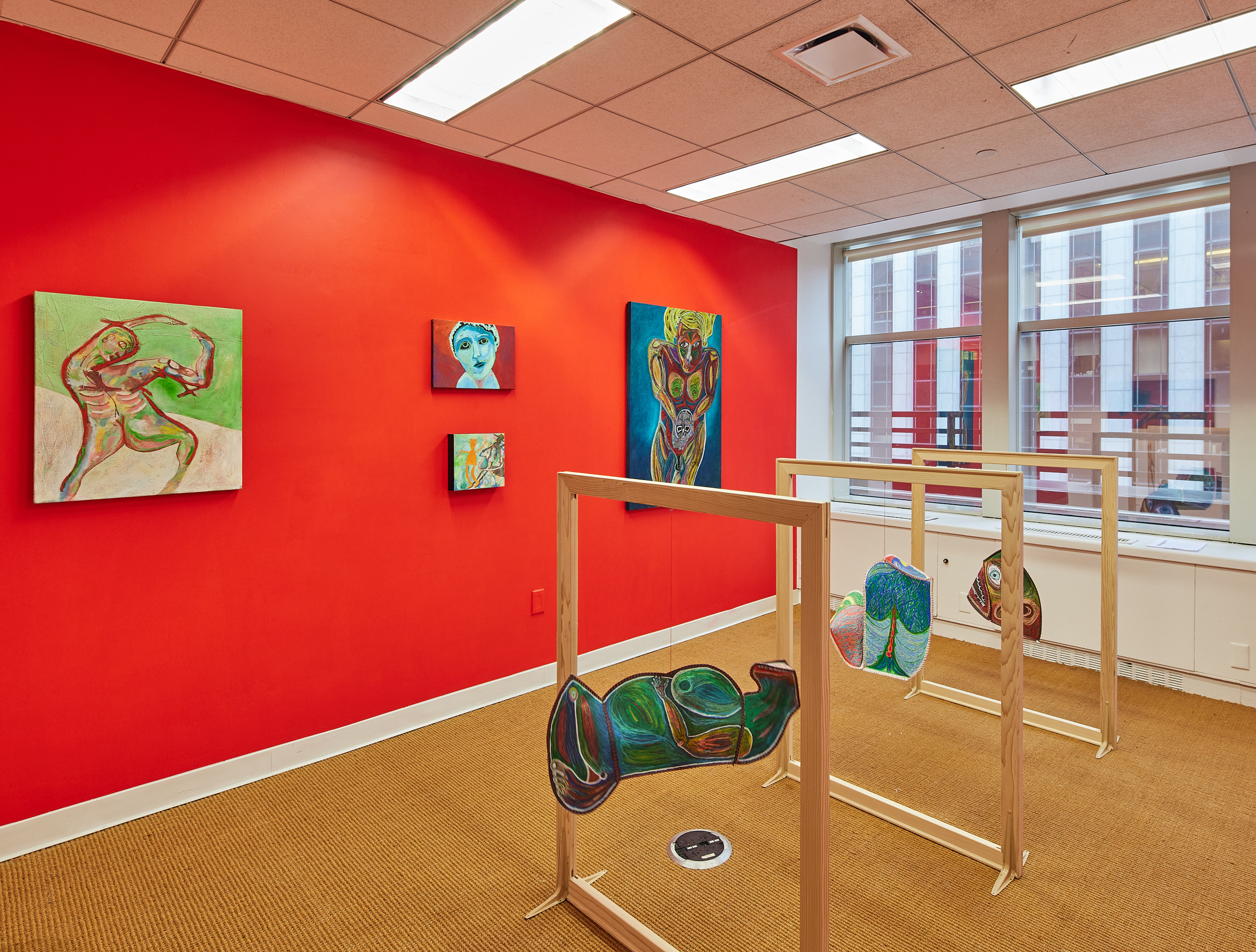 The paper and thread sculptures are to be displayed hanged by nylon threads inside stretcher bars. In “Labor I” and “Head” we see absurdly monstrous images that reveal conflicting characters of the human being, multifaceted behavior and the marvelous gift of creating life. In “Labor II”, we can see a monstrous individual, headless, skinless, weirdly formed, giving birth to something that might be different or carry hope. That same individual takes a more human shape in “dancer”, where a body in transformation sets itself in a dance movement.